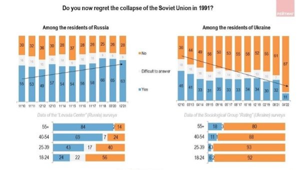 The application of history as a major point of divergence between Russia and Ukraine is even more stark when we look at polling on other socio-political stances that also inform identity:
