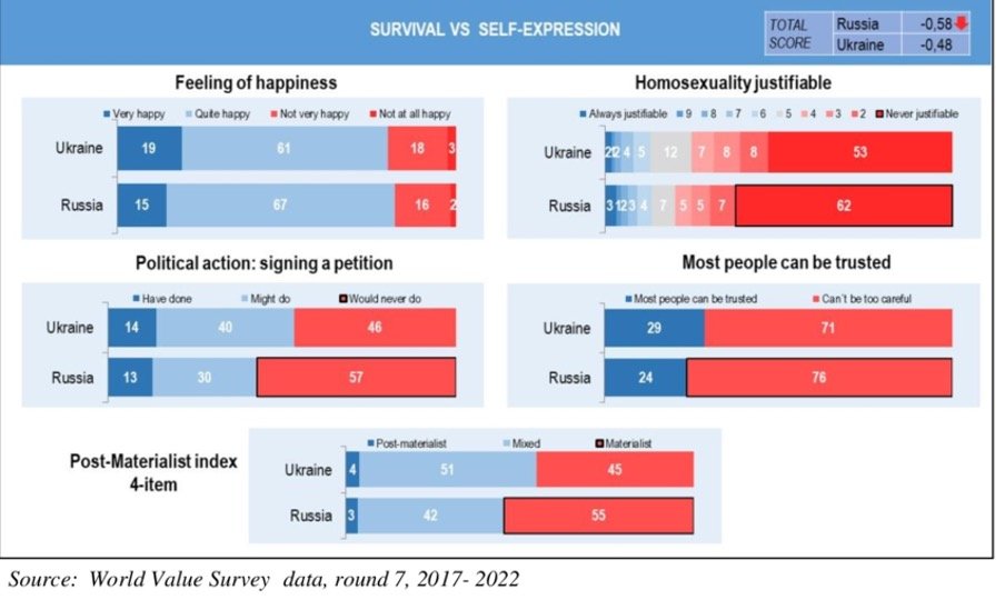 Both countries share similar perspectives on happiness, trust, and some aspects of social and political policy. Furthermore, a large proportion of both populations believe that homosexuality is never justifiable. Naturally, there are some differences; Ukrainians generally show slightly higher levels of happiness, more openness to political action, and a more balanced view between materialist and post-materialist values. In contrast, Russians tend to be more conservative on issues like homosexuality and trust and demonstrate less openness to the idea of signing a petition, with 40 per cent of Ukrainians indicating they might do so, compared to 30 per cent of Russians.
