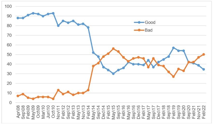 The shift in Ukrainian identity between 2014 and 2022 was remarkable. In 2013, Vladimir Putin enjoyed an approval rating among Ukrainians of 59 per cent, higher than in Russia itself, and 81 per cent of Ukrainians felt positively about Russia. In the last KIIS poll before the full-scale invasion, that number was a mere 34 per cent.