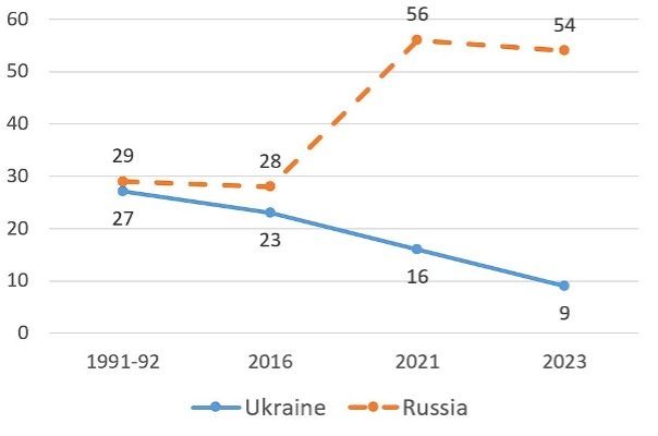 By 2023, only 9 per cent of the Ukrainian population views Stalin positively, a significant decline from earlier decades. In contrast, Russia’s trend shows initial stability, followed by a sharp increase in positive views of Stalin between 2016 and 2021. By 2023, despite a slight decline from 2021, a majority of 54 per cent of Russians still view Stalin positively. Both countries started with similar percentages in the early 1990s, with Ukraine at 27 per cent and Russia at 29 per cent. By 2016, these percentages had slightly decreased, with Ukraine at 23 per cent and Russia at 28 per cent, however, from this point onwards, the countries’ perceptions diverged significantly. In Ukraine, positive views had dropped to 9 per cent by 2023. Meanwhile, Russia experienced a substantial increase in positive views, reaching 56 per cent in 2021 and maintaining a high level of 54 per cent in 2023.